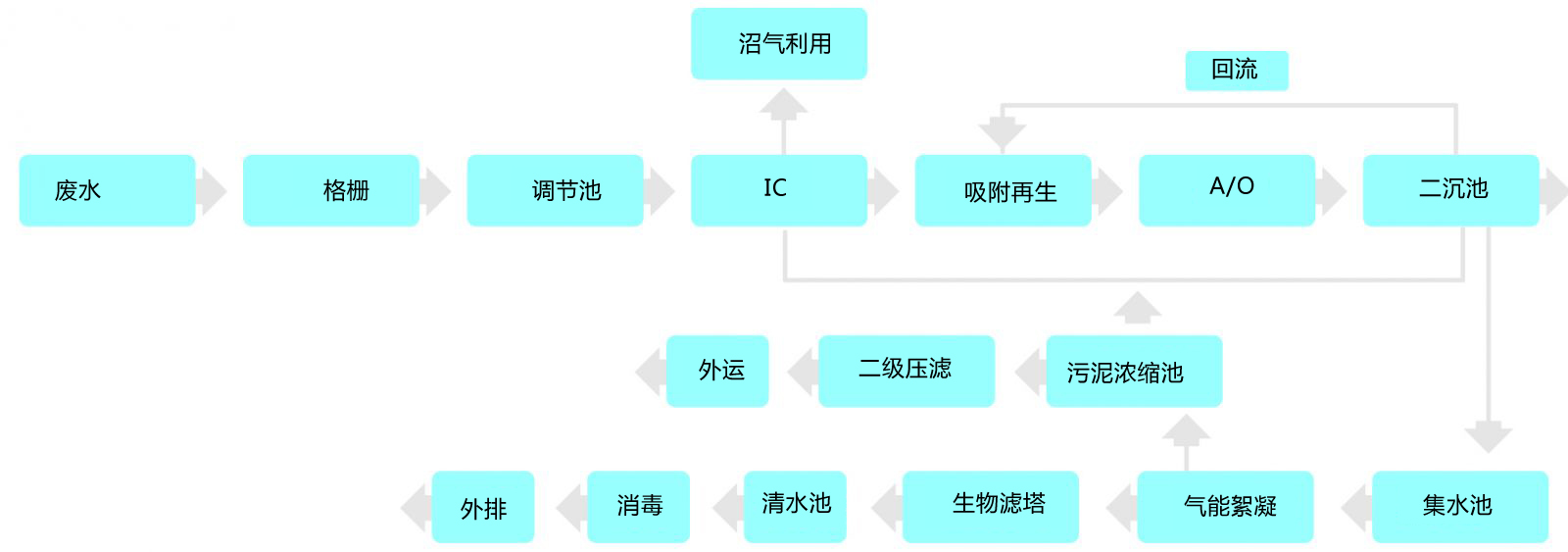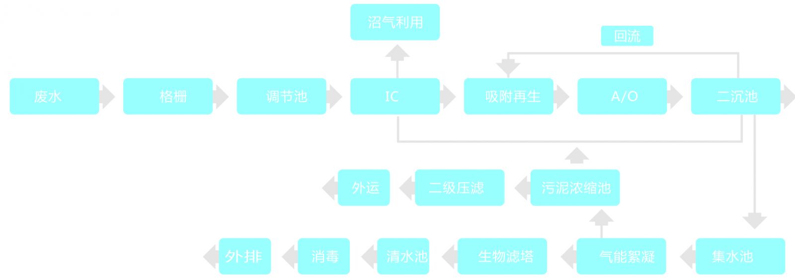 廢水經(jīng)格柵預(yù)處理,去除大的漂浮物質(zhì)后進入調(diào)節(jié)池勻和水質(zhì)水量,調(diào)節(jié)后的污水進入IC高效厭氧反應(yīng)器,廢水在反應(yīng)器中自下而上流動,有機污染物被高濃度的厭氧顆粒污泥吸附并降解,同時IC可以通過內(nèi)循環(huán)改善傳質(zhì)效果,并實現(xiàn)自動稀釋進水,不僅降低了有機物負(fù)荷,還能有效保證進水濃度的穩(wěn)定性,極大地提高對COD等有機污染物的處理效率。出水進入A/O反應(yīng)池,通過缺氧/好氧工段高效去除COD并實現(xiàn)脫氮功能。處理后的出水經(jīng)二沉池進行固液分離后,進入氣能絮凝系統(tǒng)進一步去除水中殘留的細(xì)小懸浮物。再由具備生物代謝與吸附過濾雙重功能的生物濾塔處理,出水消毒后即可達標(biāo)外排。