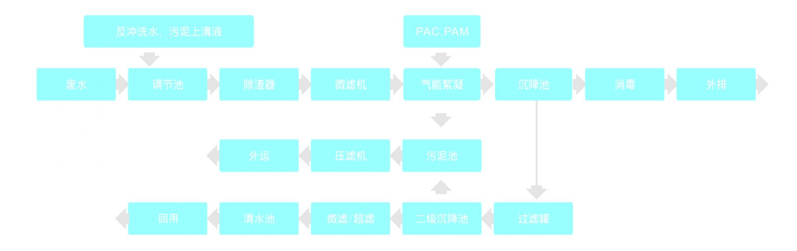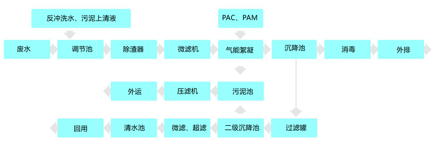 廢水首先進入調(diào)節(jié)池進行水質(zhì)、水量調(diào)節(jié),提升后進入兩級高濃除渣器去除廢水中的顆粒雜質(zhì),然后經(jīng)微濾機收集廢水中相對細小的棉渣回用,為后續(xù)處理工藝減輕負荷。出水經(jīng)泵提升至氣能絮凝系統(tǒng)加藥(PAM與PAC)混合后去除原水中所含的大量膠質(zhì),出水到沉降池,上清液經(jīng)消毒后可達標(biāo)外排。如中水回用,則提升至多級精細過濾系統(tǒng)過濾后進入中間水池,經(jīng)超濾系統(tǒng)處理后回用。