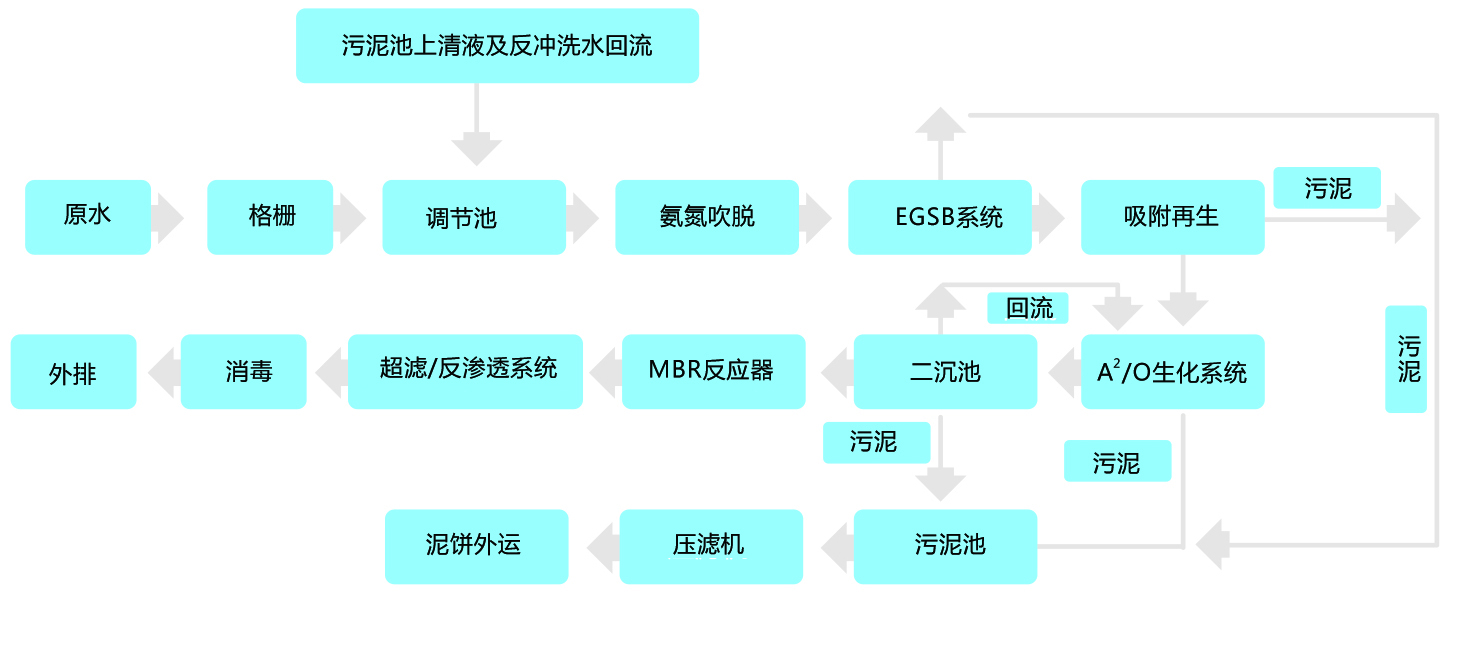 經(jīng)過格柵的垃圾滲濾液與其它地表污水混合后,進(jìn)調(diào)節(jié)池進(jìn)行水質(zhì)水量的均和,再通過吹脫塔去除所含的氨氮污染物質(zhì),調(diào)pH值后進(jìn)入EGSB反應(yīng)器,利用反應(yīng)器內(nèi)形成的厭氧顆粒污泥高效降低COD,出水經(jīng)由A2/O進(jìn)一步降解有機(jī)污染物,并高效去除污水中氮、磷,二沉池出水通過超濾/反滲透系統(tǒng)對(duì)重金屬離子進(jìn)行精細(xì)處理,出水經(jīng)消毒達(dá)標(biāo)后外排。
