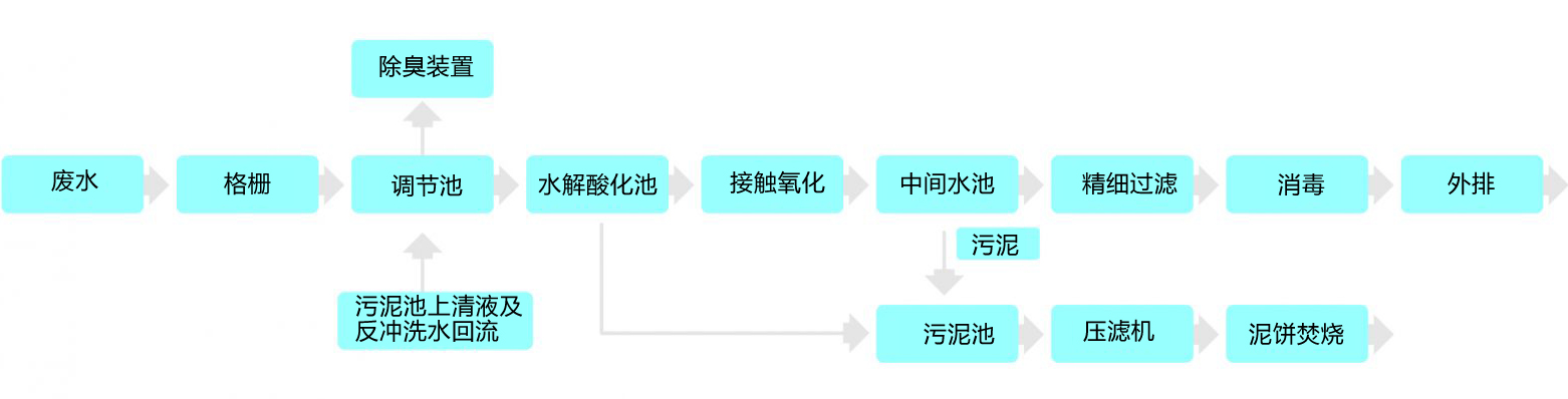 水解酸化池、中間水池內的污泥排入污泥池,通過壓濾機脫水后的泥餅經鍋爐焚燒(主要是殺滅污泥中含有的病菌、病毒、寄生蟲卵),或在泥餅中摻入石灰、植物秸桿攪拌均勻,堆放熟化滅菌,3個月后外運或填埋。